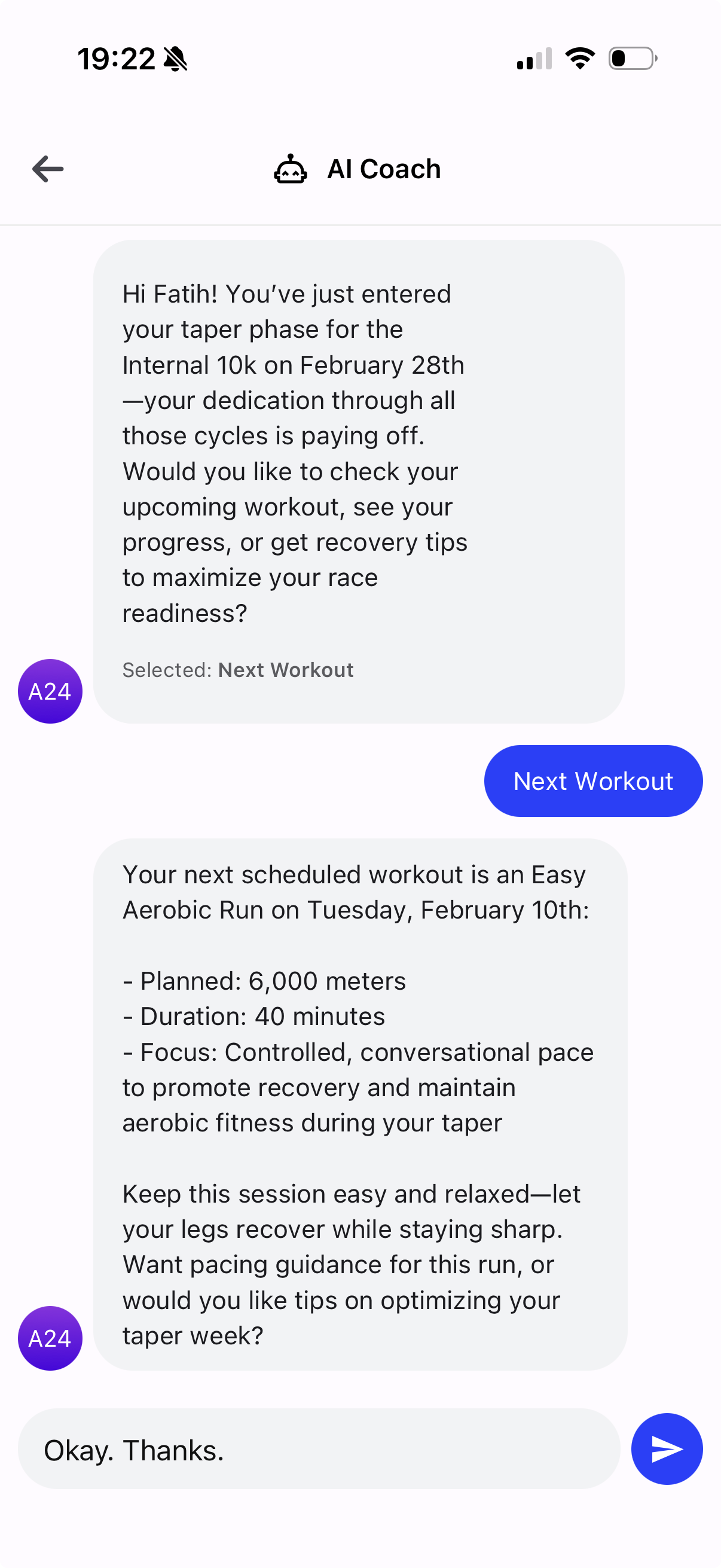 Have a question about your training? Feeling tired? Need motivation? Your AI coach is always there to help, guide, and support you through every step of your journey.