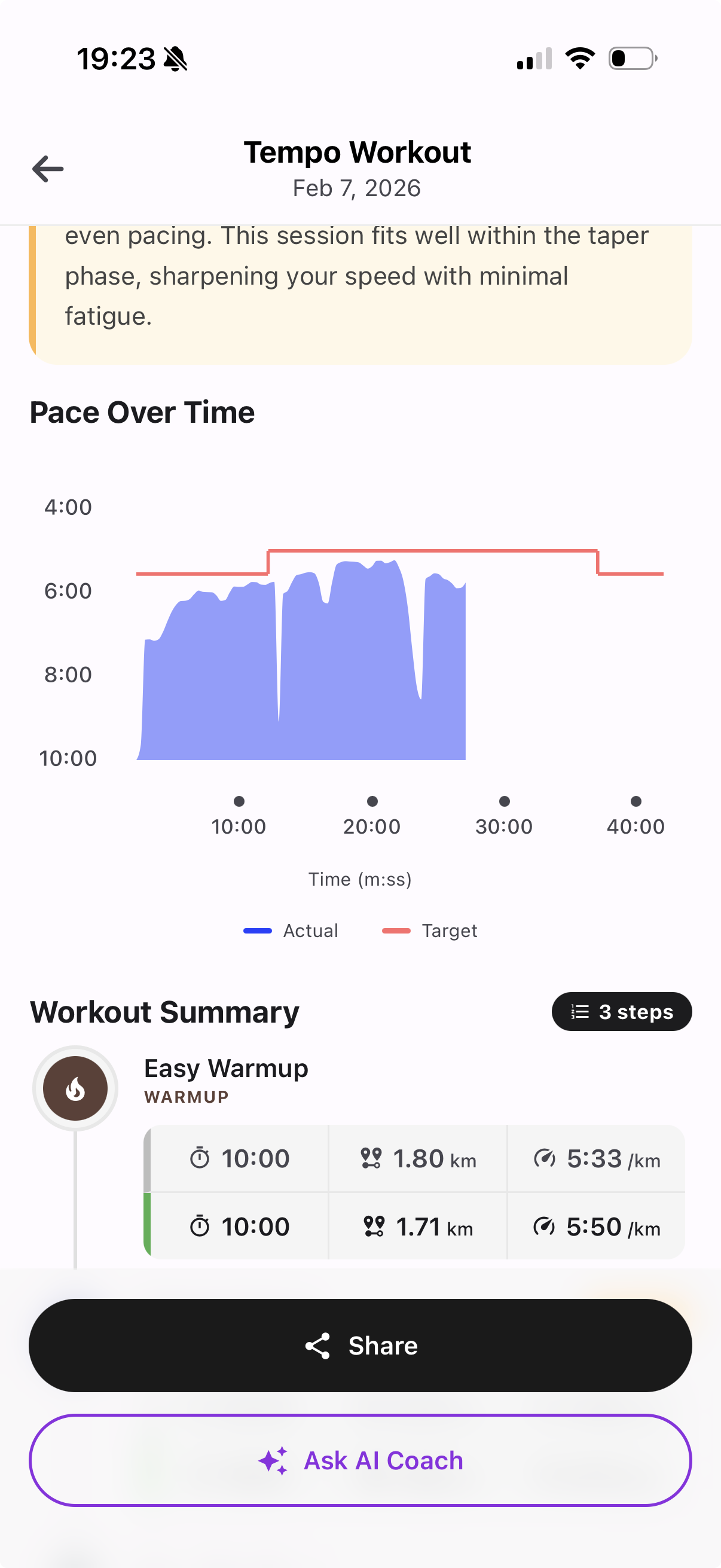 No more guessing. Each workout breaks down into precise intervals with exact paces, distances, and recovery periods—just like a professional coach would plan.